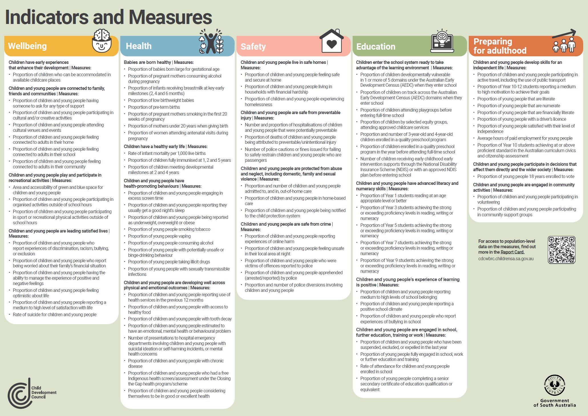 The Report Card uses population-level data to track the Measures in South Australia’s Outcomes Framework for Children and Young People, to reveal current trends and areas for improvement. Where possible, we disaggregate the data into relevant groups of interest, including Aboriginal children and young people. See below the list of Indicators and Measures.